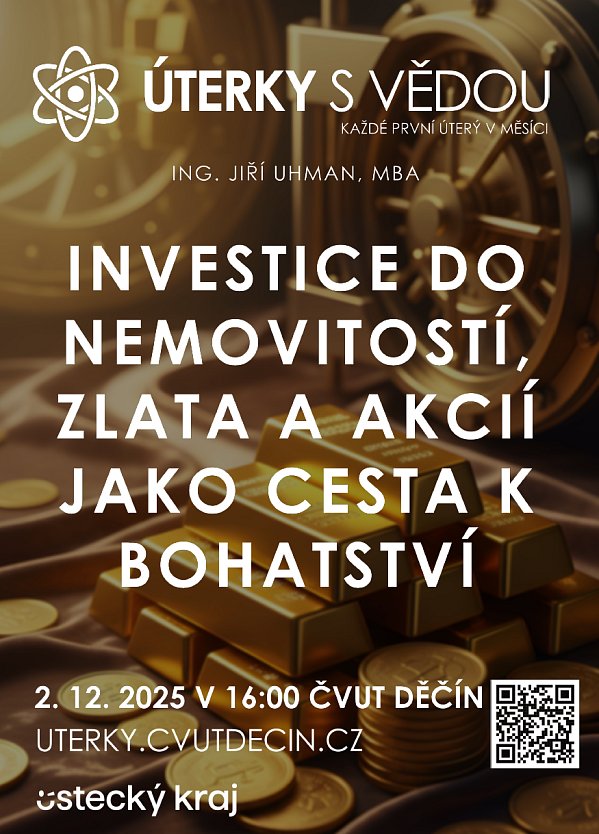 2. 12. 2025, 16:00, ČVUT Děčín Tématem přednášky jsou tentokrát Investice do nemovitostí, zlata a akcií jako cesta k bohatství. Pochopíte, že tyto investice nejsou tak složité, jak se na první pohled může zdát. | |