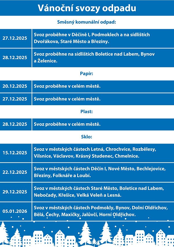Primátor města Jiří Anděl se před Vánoci setkal s veliteli čtyř jednotek dobrovolných hasičů. Probral s nimi aktuální situaci a předal za vedení města drobné dárky. Město Děčín dobrovolné hasiče dlouhodobě podporuje modernizací vybavení či pořizováním nové techniky. Letos například proběhla rekonstrukce hasičské zbrojnice v Křešicích.